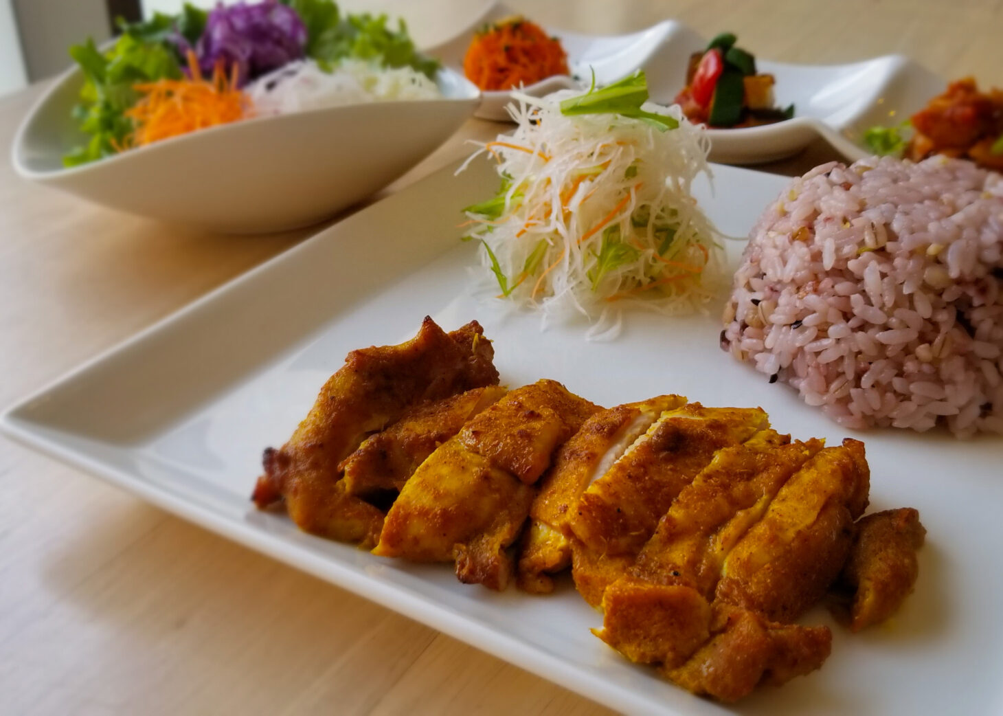 サラダと前菜3品がセットになっており、ごはんは十六穀米です。