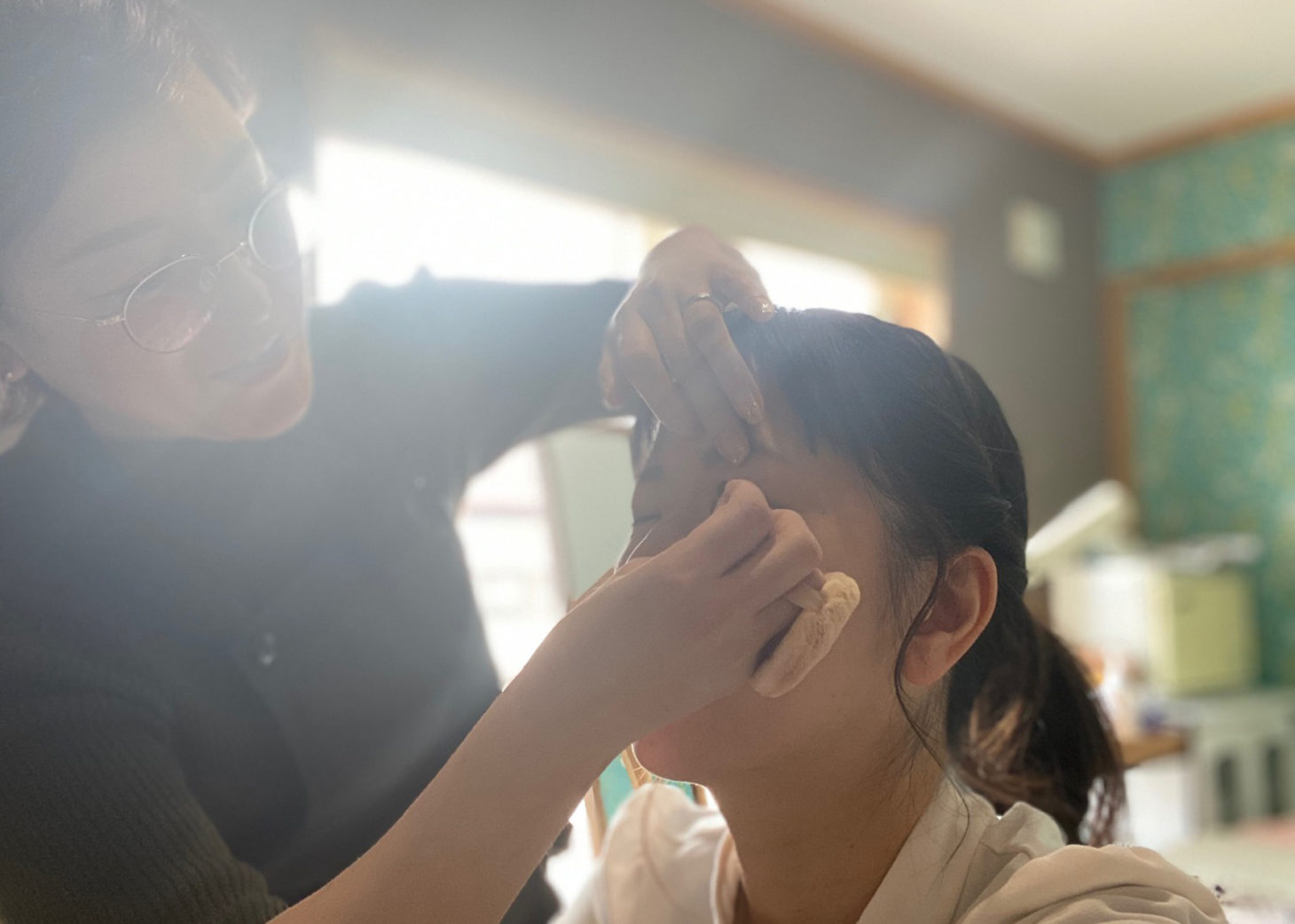 まずはメイクとヘアのセット。そのあと着付けです。